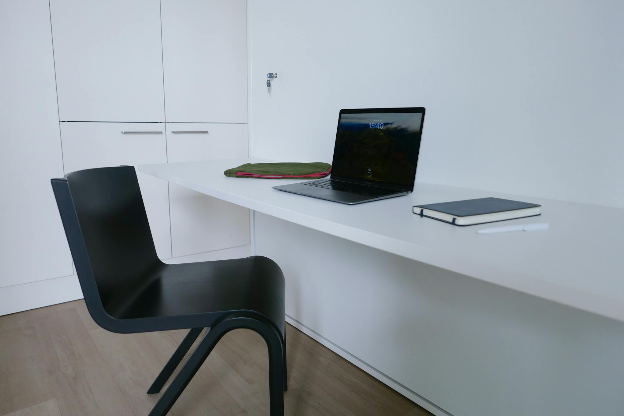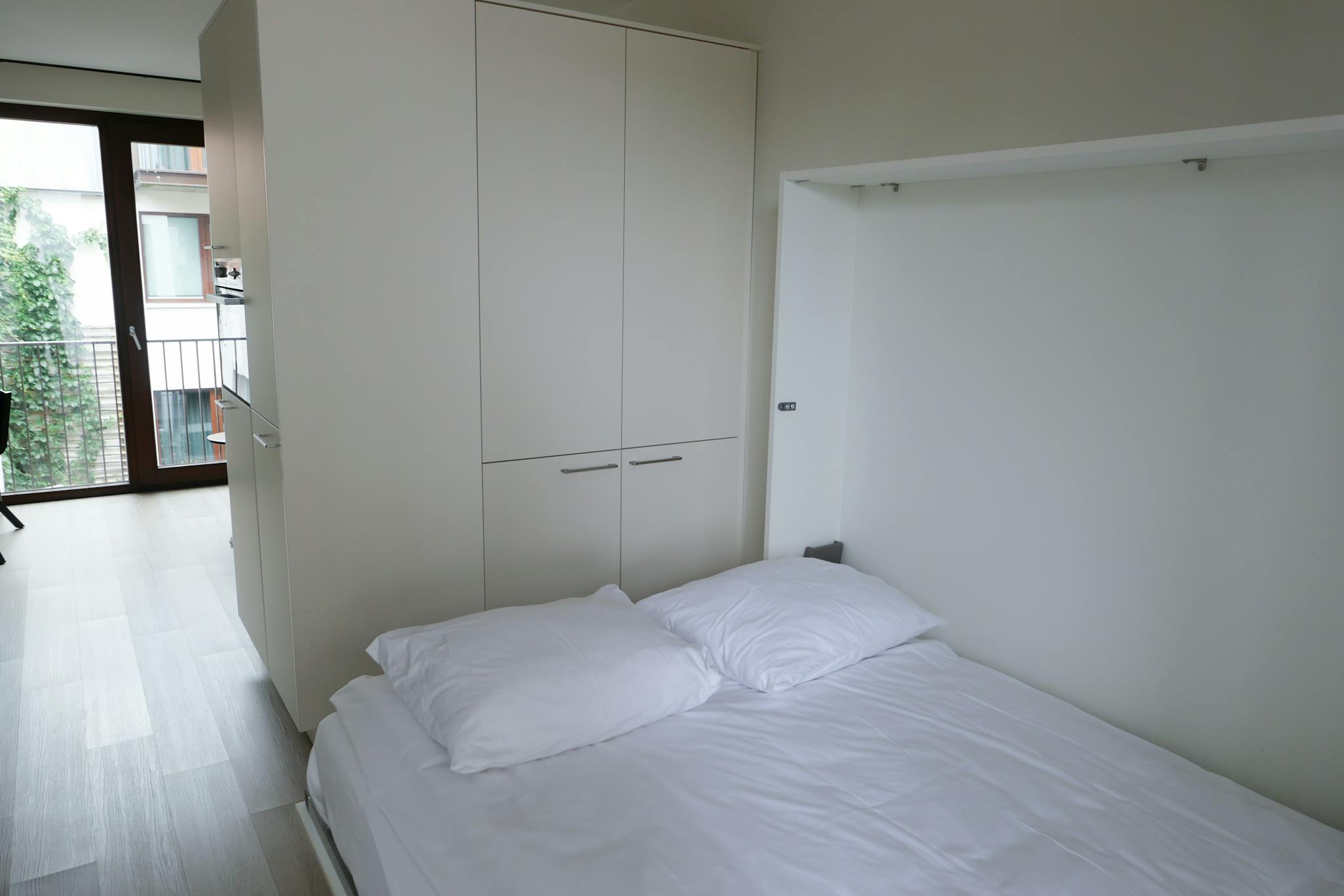 The design of this property has a very modern approach, giving it a very chic appearance. The Scandinavian interior ensures plenty of brightness and light in the studio. The space is cleverly divided by using a desk bed. This piece of furniture functions when unfolded as a bed (160x200) and folded as a desk to save space.