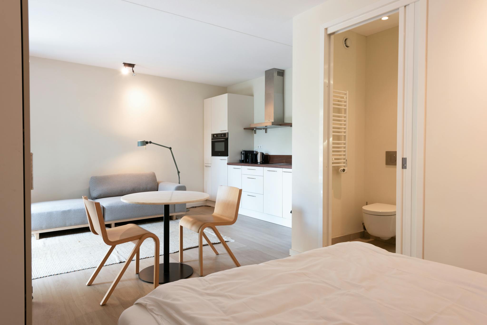 The courtyard studios are the smallest studios we offer in terms of square meters, but that certainly does not make them less pleasant to stay in. The smart layout ensures that they still feel spacious and because of the view of the courtyard, the studio feels light, spacious, and relaxing.