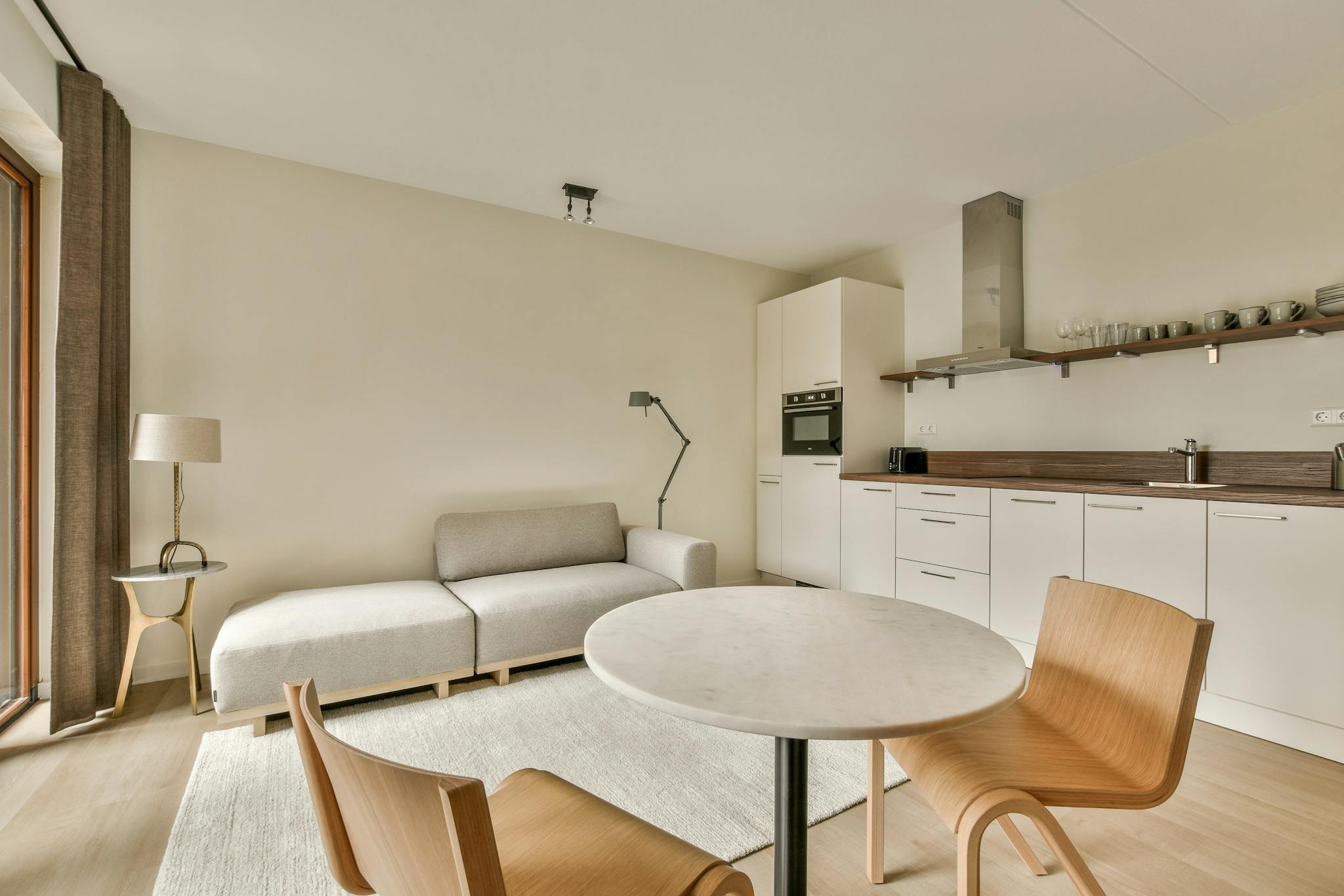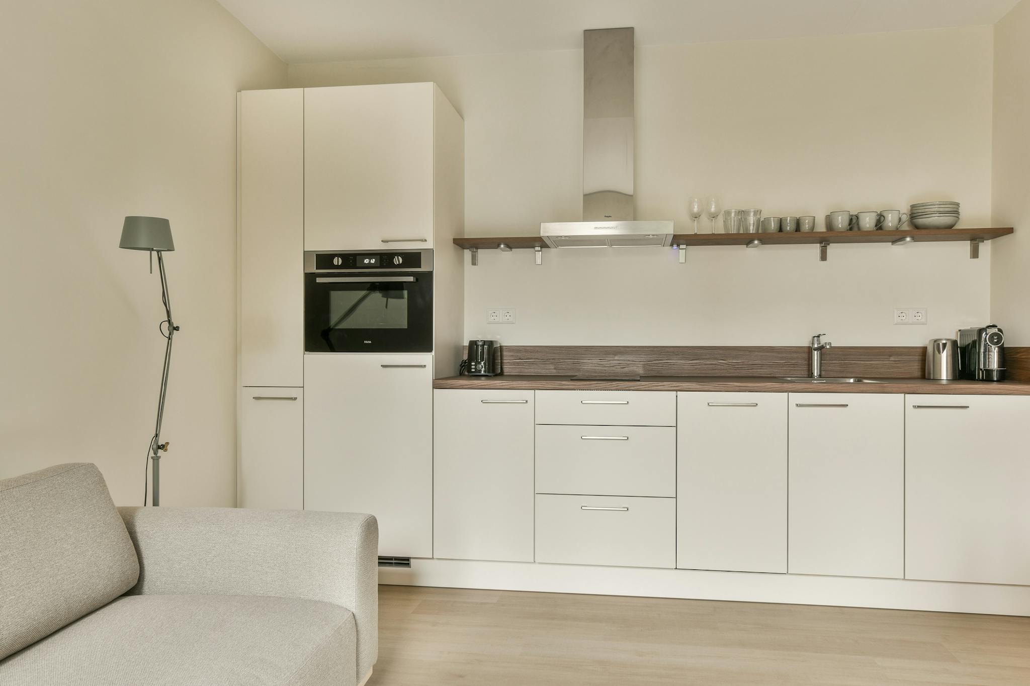 This beautiful ground-floor studio of 35 square meters is located directly adjacent to the inner garden of the apartment complex. When you open the French doors, you can sit right in the lovely garden. The studio itself is fully equipped and has a foldable bed of 160x200 cm. When folded, this piece of furniture functions as a desk, and when unfolded, it serves as a double bed. Additionally, the studio also has a dining table with two chairs, a sofa, and a wardrobe. The kitchen is also fully equipped, and the bathroom offers space for a toilet and a walk-in shower.