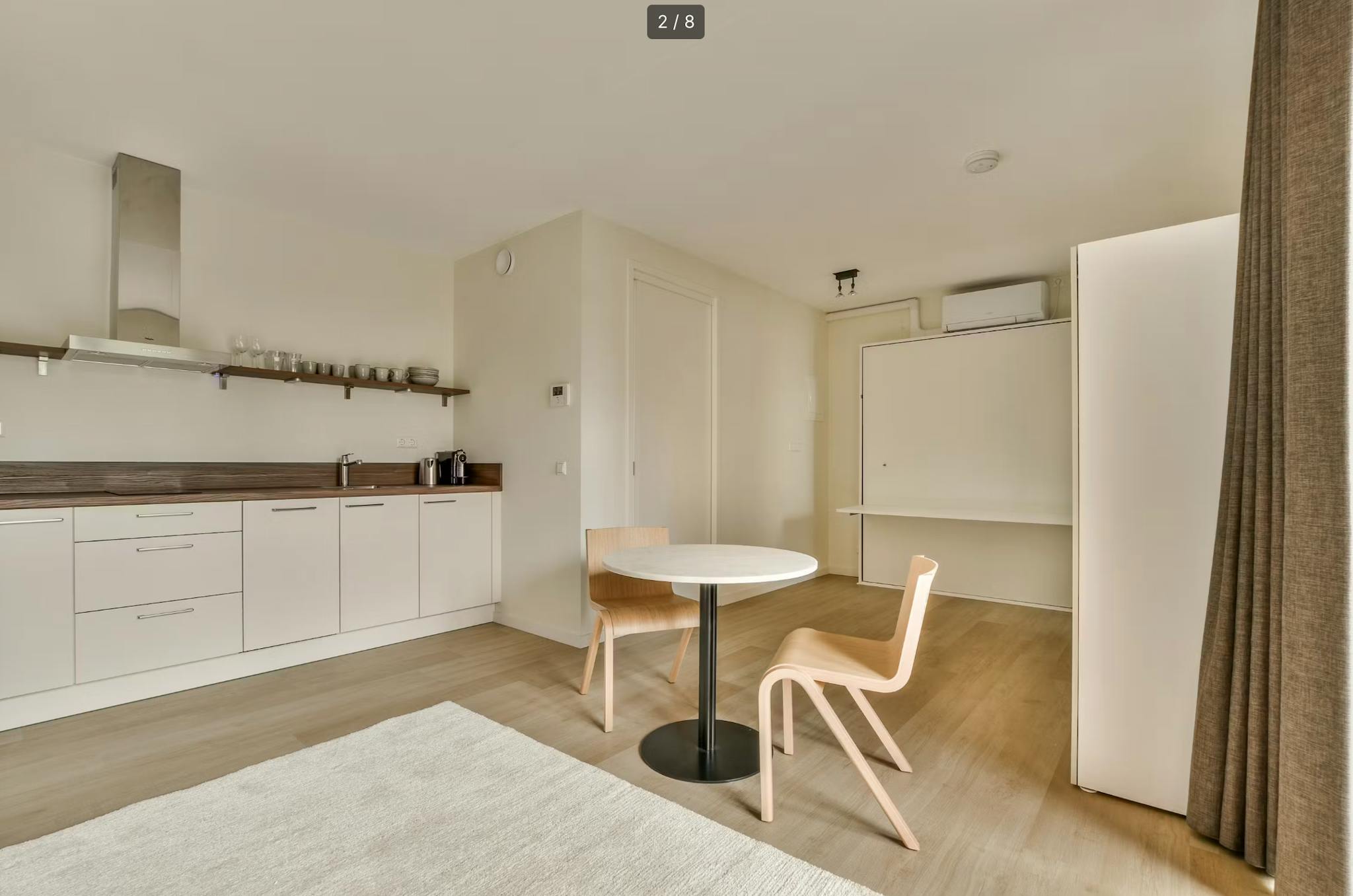 The design of this property has a very modern approach, giving it a very chic appearance. The Scandinavian interior ensures plenty of brightness and light in the studio. The space is cleverly divided by using a desk bed. This piece of furniture functions when unfolded as a bed (160x200) and folded as a desk to save space. The other bed on the upper floor of the apartment is a regular double bed.