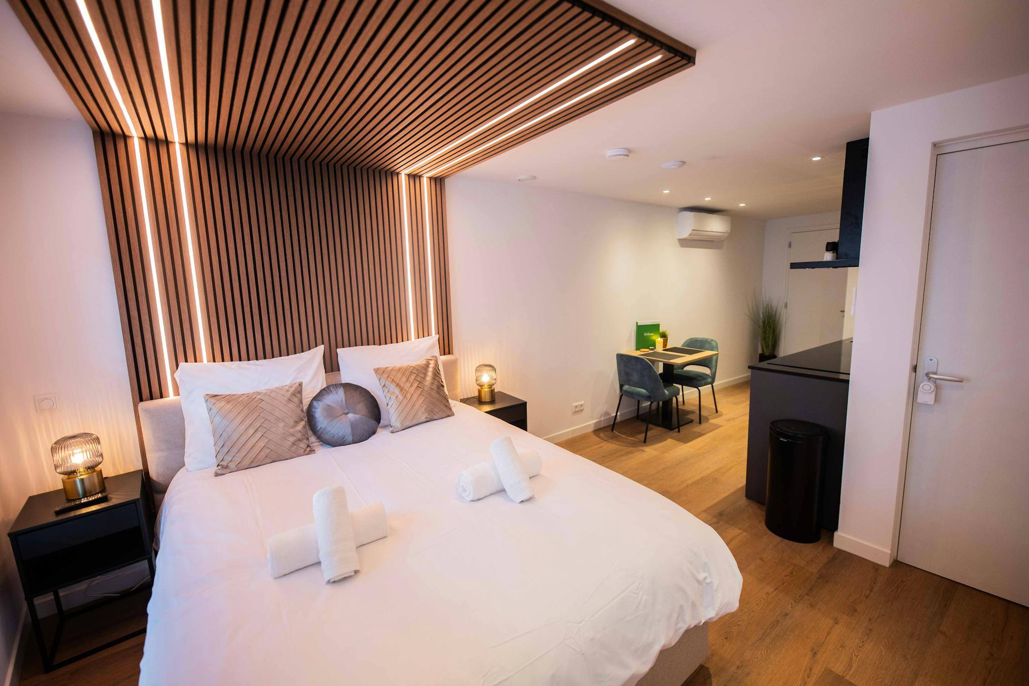 Non-SmokingNot allowedEnjoy a stylish experience at this centrally-located 35m2 designer studio in Eindhoven - close to everything you need! This accommodation is newly built in 2023. Featuring an open plan living / dinning area with a quality queen-bed, TV, AC, fully equipped kitchen, dining table, luxury bathroom with walkin shower and a washing machine / dryer. It easily accommodates up to 2 people and guarantees you a perfect stay!