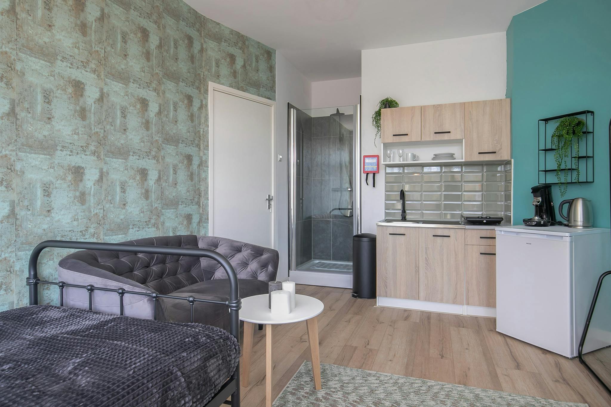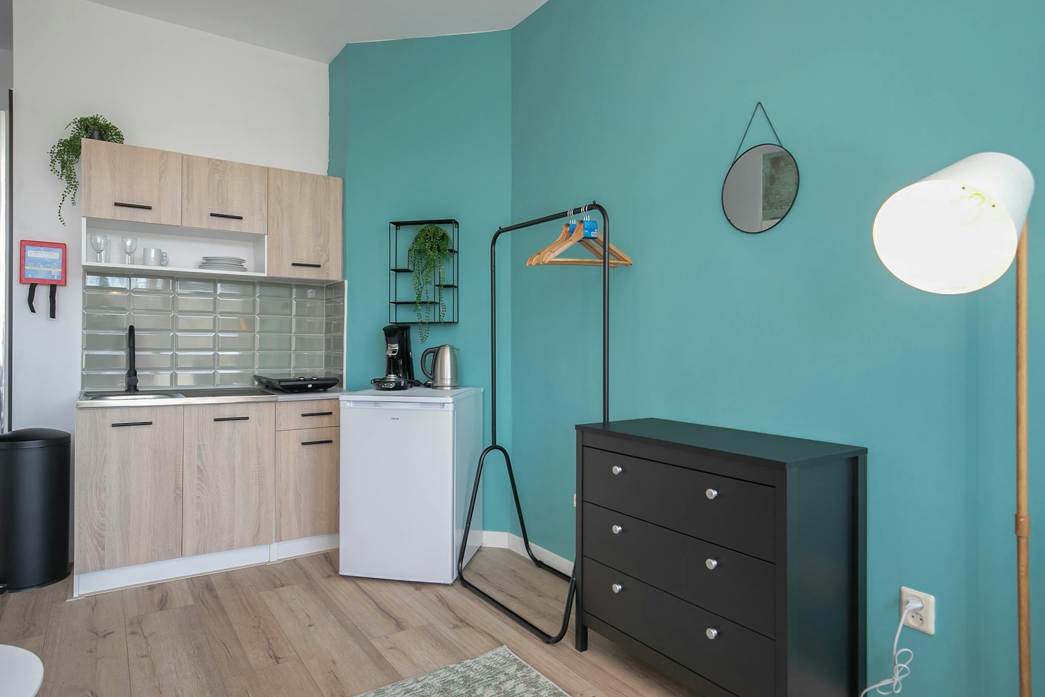 The apartment is very well maintained. In this house are a total of 3 furnished studios made. The toilet, balcony and a common laundry room you share with 2 other people. Each studio has a pleasant light and the area is very well maintained.