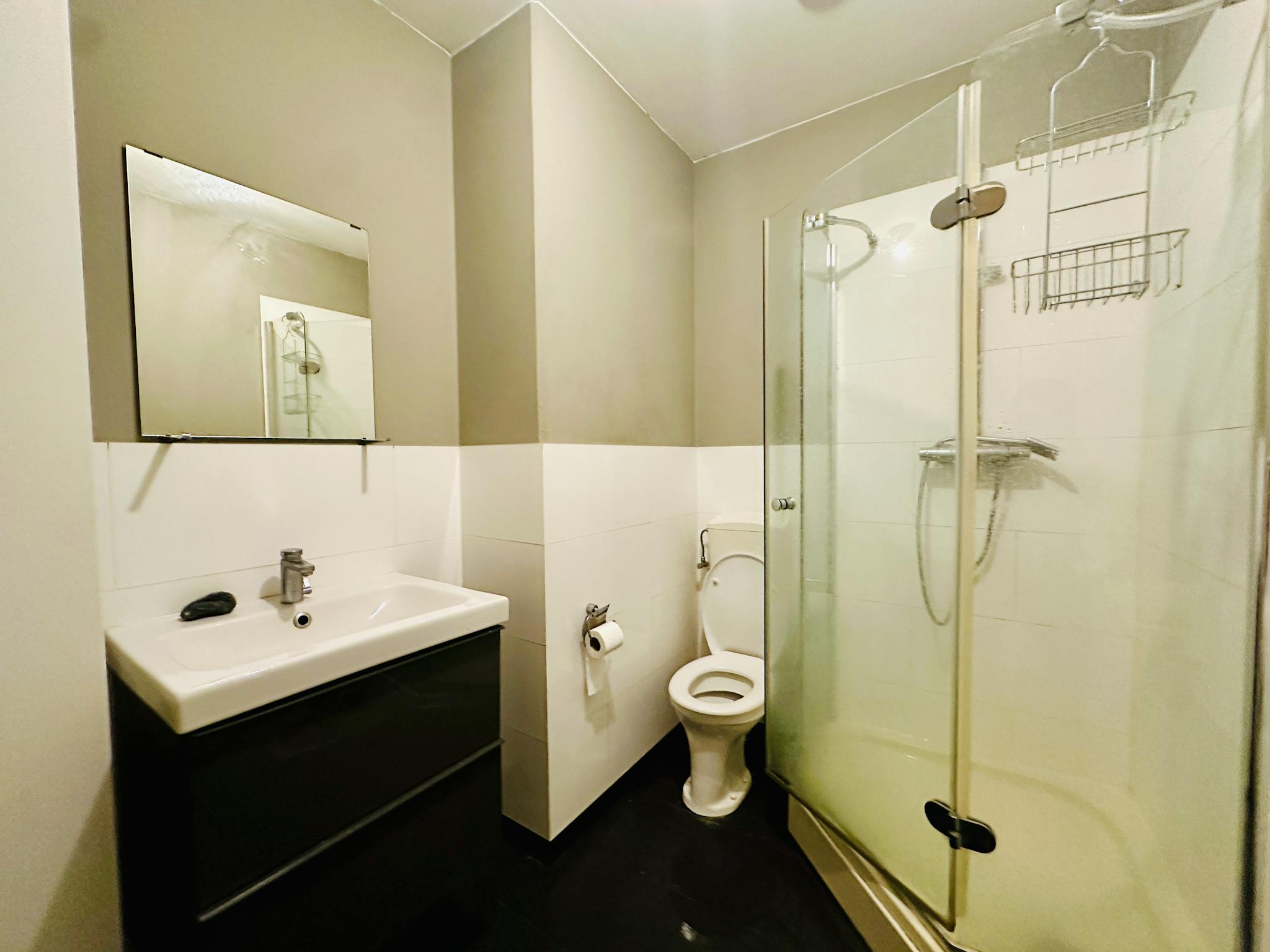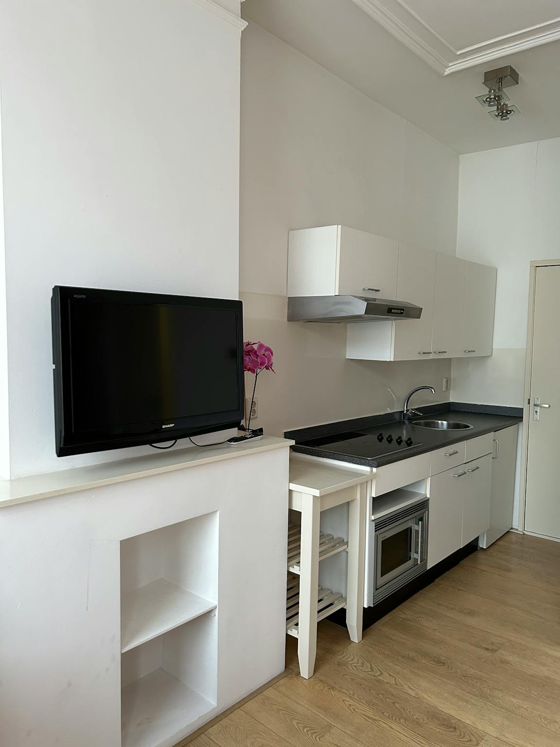 Shared entrance to the second floor. Compact kitchen with microwave and ceramic cooking plate. On the corridor is a wash machine and dryer to share.