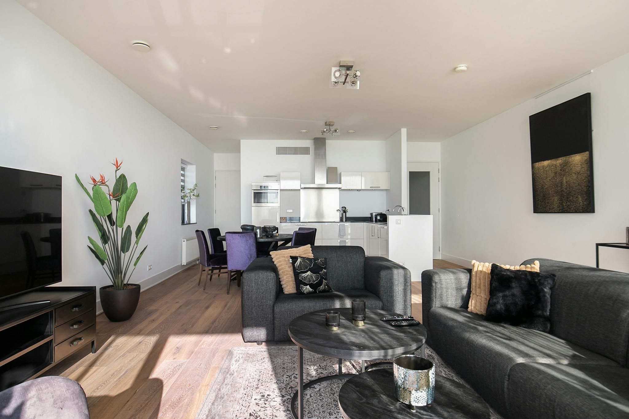 The apartments stand out because of the good use of space, sophisticated application of light and high quality material and the way the landscape of the housing is allowed. Each apartment has two spacious bedrooms with their own bathroom with bath and toilet. This appartment has a spacious living room with an open kitchen with all equipment. From the living room you have access to a balcony with a beautiful view.